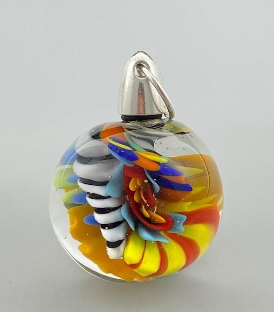 Measurements: 1" drop from the Jump ring. 1 1/4" wide. Implosion Marble pendants are a practice technique to refine and explore for a deeper implosion and a beautiful sight once completed. These pendants can be made into a piece of Jewelry, Ornament, Lamp pull, Fan pull and so much more options. This was beautifully handmade by Susan Matych-Hager in November 2020 this is one of her first series of Implosion Pendants. Message from Artist: These off-mandrel pendants are created using Italian soda-lime glass. Some of the pendants are marble-shaped and some are large lentils. The challenging process involves creating designs in the glass and heating the glass so that the design becomes compressed (or imploded) into the center of the glass. Each pendant is unique, even though several of a similar design may be made in a series. Every effort is made to have an attractive design regardless of the view of the pendant. When a metal bail is used, it is stainless steel.